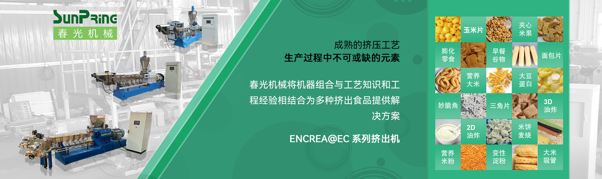 濟(jì)南春光機(jī)械設(shè)備有限公司是專業(yè)從事雙螺桿食品膨化機(jī)的新興企業(yè)。我公司匯聚了行業(yè)工作十?dāng)?shù)年的專家隊(duì)伍,不僅在擠壓技術(shù)研究方面傾盡全力,更努力在食品工藝方面不斷探索,以便客戶生產(chǎn)出市場(chǎng)領(lǐng)先食品。